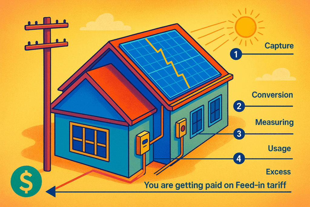 The operation is further refined by network-enabled smart meters, meticulously measuring both household electricity usage and the energy fed back into the grid.